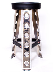 High-quality aluminum race stools hand crafted in our shop. Great for the garage, and even racetrack. With the three leg design and rubber feet they have great stability on uneven ground.
