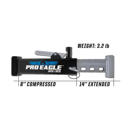 Turn your Pro Eagle Jack into a JACK STAND with this user friendly tool. Extends into place with the push of a lever, locking your Jack at the height you need until it is removed. Holds even if hydraulic pressure is released accidentally, and when you are done, it's small enough to store in a drawer or glove box. Not something you can do with a space hogging jack stand. Designed to work with all Pro Eagle's wheeled Jacks.