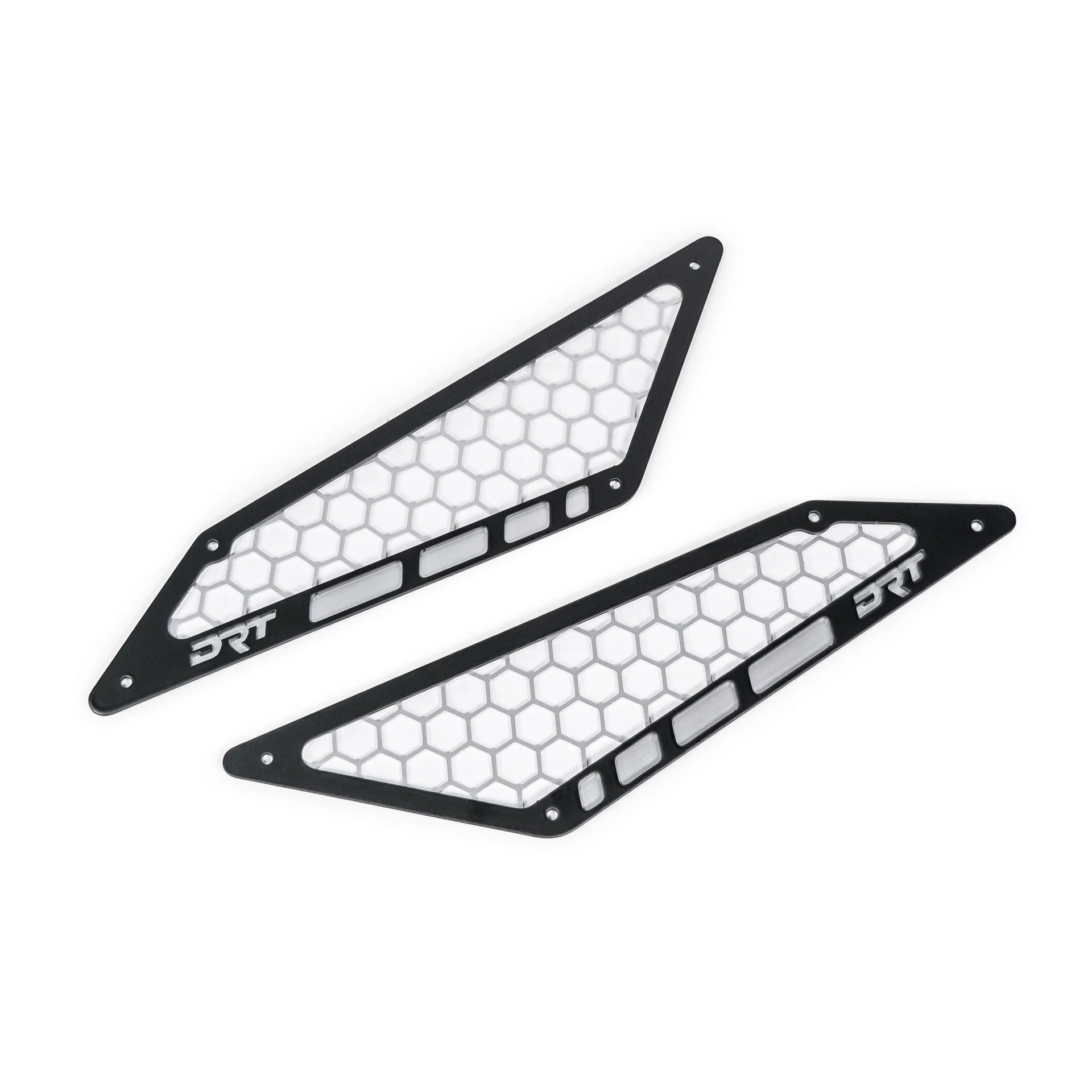 The outer set features an outer frame with premium DRT branding and an inner laser cut panel with contrast panels that let the bright anodized finish come through. The outer kit is available on its own under (P/N 20005IV06101). The inner kit features 4 aluminum mesh plates for each pocketed area of the inner intake vents, and a single-formed top frame to cover both mesh joining both inner panels. Removal of OEM deflectors P/N 5457037 & 5457038 is required on Pro R and Turbo R models to use the inner kit.