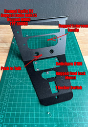 This mount will allow you to mount your radios in the factory area of your rocker switches, as well as mount your switchpro9100. 2 Push to Talk slots under the intercom. Switchpro 9100, Dual Rugged Jack Mount and 1 rocker switch slot. Console extend all the way down the lower section fitting it nice and flush for a factory look.